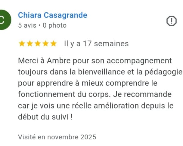 Ambre m’a beaucoup aidée, avec une approche très douce et totalement bienveillante, à identifier et à détendre des nœuds émotionnels profond, mais également à investir des espaces intérieurs et extérieurs dans lesquels je m’empêchait d’aller.